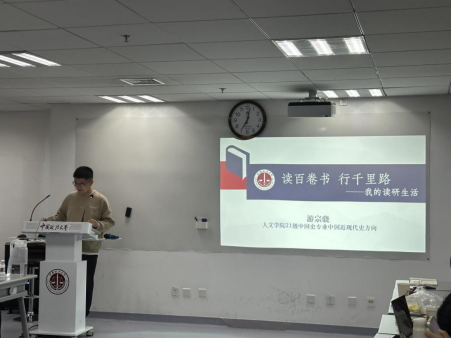 在接下来的学长分享环节,首先发言的是2021级中国史专业的游宗骁同学。生活中一向注重计划的他为大家提供了制定详细、具体计划的建议。此外他还介绍了自己日常在专业学习与校内外实习时间工作中的经验心得。他特别鼓励同学们积极参与学术会议和论文比赛,以及学校组织的暑期实践活动,并分享了自己从中的一系列宝贵收获。