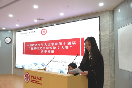 致辞之后,主持人宣布答辩正式开始,参赛选手按照赛前抽签确定的顺序依次进行个人陈述及答辩,答辩委员会的评委老师们也逐一对选手们的论文进行了颇具针对性的提问,过程中不仅有精彩学术观点的碰撞与交锋,也有评委老师们对参赛论文的细致点评和宝贵建议。选手答辩环节结束后全体同学离场,由评委老师们讨论并给出最终的得分和获奖名单。