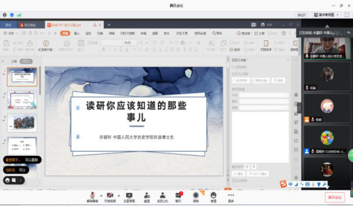 第二位主讲嘉宾来自中国人民大学历史学院博士生许颖轩。许颖轩师姐从读研的初心、读研的规划、读研要避开的坑、求职和考博四个方面展开。她表示自我学习和自我成长是最重要的,在读研过程中应当掌握好在学习、人际交往等方面的平衡。针对毕业论文与考博同时进行,如何联系导师和学校,如何应对未知的突发状况的难题,她建议应当多渠道了解相关信息,同时列举部分考博参考书目,并传授她的考博心得。