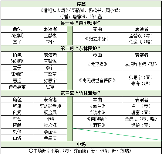 第一幕“悬印归里”,陶渊明作《归去来辞》,以表不为五斗米折腰之志。第二幕“东林围炉”,陆修静道长的一曲《龙翔操》,如云中龙翔、飘然入云,慧远法师以《南无观世音菩萨》相答,一派肃穆庄严之气,令人思念起故人往事。
