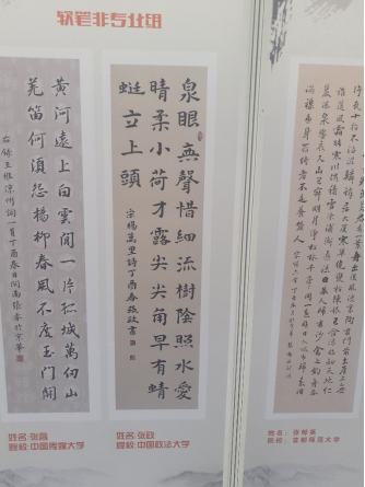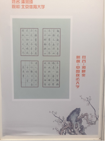 2017年6月24日下午,第六届北京市大学生书法大赛决赛在首都师范大学北一区体育馆内举行。我校同学凭借优秀的书法作品再获佳绩,其中,张政、郭文汐同学获得非专业软笔组二等奖,魏伊槿同学获得非专业软笔组三等奖;刘晨爽同学获得硬笔组二等奖。