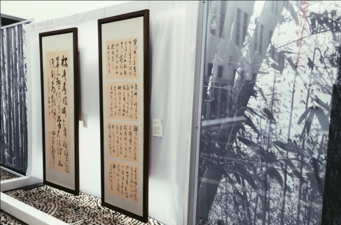 “遗爱百年——孙鹤书法作品展”书展现场以斑驳的竹林为背景,脚下是鹅卵青石,让人仿佛置身于林间湖畔,感受到孙鹤教授作品的清新脱俗、意境深幽。