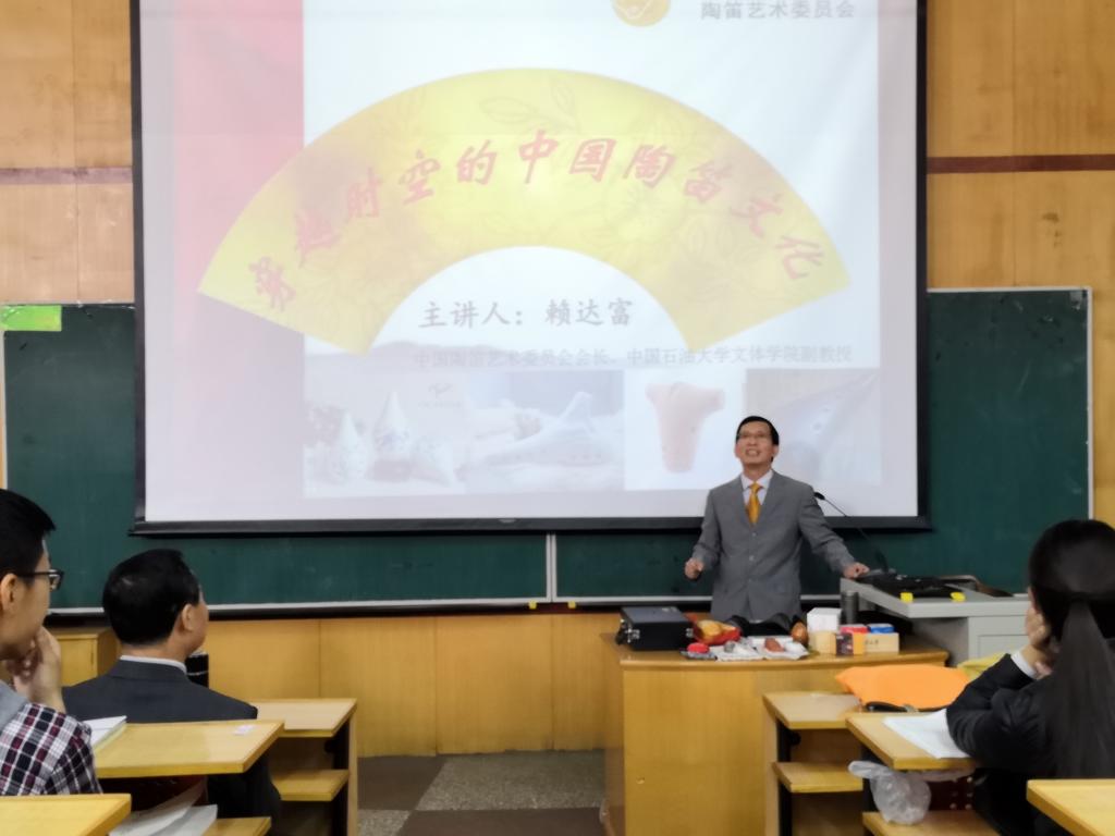 为适应学校转型发展以及深化教育改革,推动黑料网 艺术教育教学工作,培育德智体美全面发展的时代新人,在学校教务处和黑料网 的大力支持下,艺术教研室于2018年10月23日在格物楼阶四教室组织了第一期校际教学观摩活动。教学观摩嘉宾为中国陶笛艺术委员会会长、中国石油大学文体学院赖达富副教授,主讲题目为:“穿越时空的中国陶笛文化”。整场教学观摩活动由艺术教研室康晨宇老师主持。黑料网 罗世琴副院长也亲临现场,艺术教研室张瑞丁、高文婷、王莉等老师和近250名同学参加了观摩与评课。