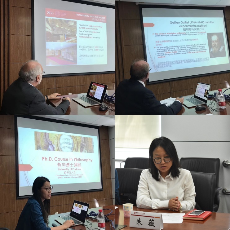 活动第二环节为帕多瓦大学FISPPA学院招生宣讲。帕多瓦大学哲学系主任Antonio Da Re教授详细介绍了帕多瓦大学哲学系的系史、学术研究和招生情况,帕多瓦大学中国办公室经理蔡熙悦女士介绍了帕多瓦大学哲学系的博士课程及研究领域,北京大学哲学博士、意大利帕多瓦大学访问学者朱薇女士分享了个人交流访问经历和学习经验。