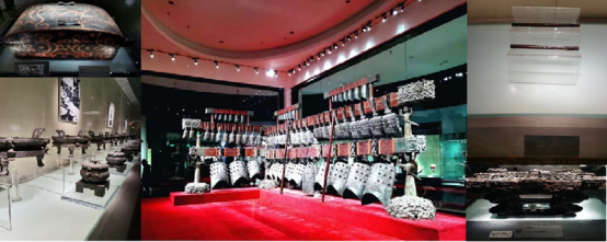 (湖北省博物馆的部分文物,包括编钟、二十八星宿图衣箱、篪等。)