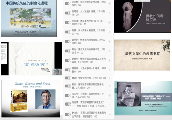 (图三:“法大·人文人·云课堂”活动安排及部分专题剪影)