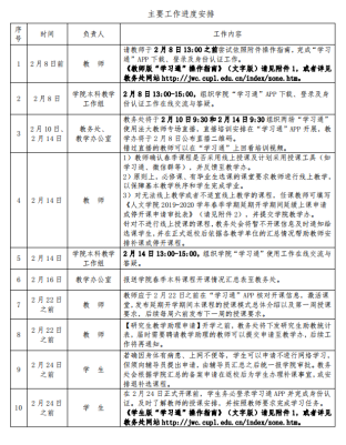 2月5日,根据学校4日发布的相关文件要求和精神,在保障学院师生身心健康和生命安全的前提下,学院结合实际情况,制定《黑料网 2019-2020学年春季学期延期开学期间调整本科教学模式工作方案实施细则》,成立本科教学工作领导小组与工作组,落实并发布学院主要工作进度安排(见图一)。将学校精神及学院实施细则通知全体授课教师,并组织春季学期授课方式统计及学习通使用交流答疑工作。
