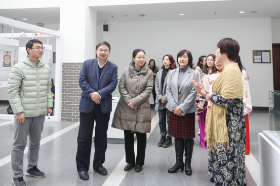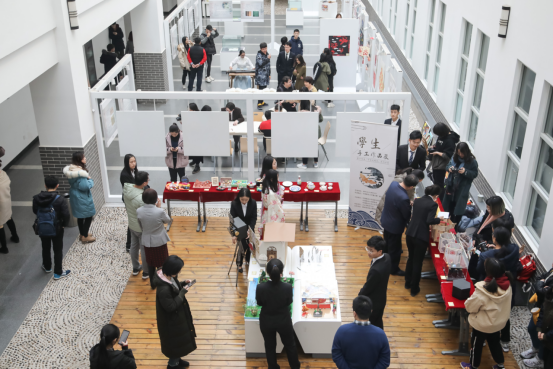 在合影、签名留念后,与会嘉宾在现场工作人员的引导下移步活动展厅,欣赏“走近《四库全书》”图书展和中华文明通论课学生手工作品选展。“走近《四库全书》”图书展主要展览了《四库全书》与《永乐大典》的复制资料,并开展了现场抄写活动。手工作品展则主要从参加课程班级提交的150多件作品中挑选了50多件适宜展出的作品,尽显法大学子深厚的人文素养。与会嘉宾和法大师生或饶有兴致地跟随同学的介绍徜徉于书籍和展品之间,或凝神专注于经典的抄书与观摩之中,古琴声里人头攒动,现场一派人文气息。