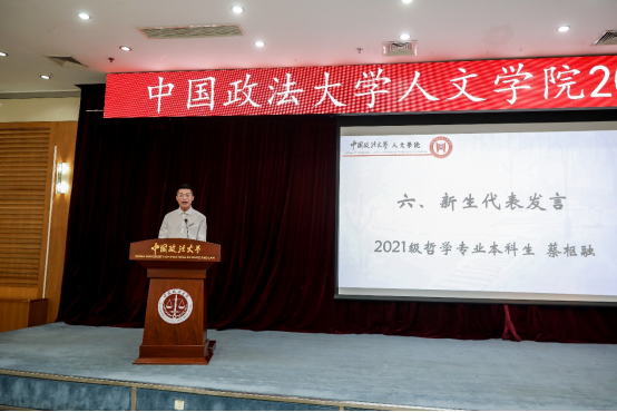 典礼第六项,新生代表2021级哲学专业本科生蔡枢融发言。