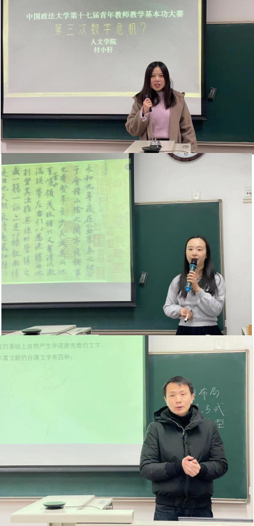 在教学展示环节,五位老师分别对不同的主题进行了精彩的讲授和展示,秦晋楠老师以“王阳明出现的社会背景”为话题对明末社会经济、人口发展等情况进行了新的解读;阴昭晖老师以“AI会思考吗”为导入对哲学与科学的思辨问题进行了讲解;付小轩老师在“第三次数学危机”的背景下对罗素悖论进行了生动的解读;姚灵老师则通过不同版本的对比对《兰亭序》的书法艺术进行了赏析;孙竞老师通过对五种造字法的讲解展示了古汉字的发展演变。