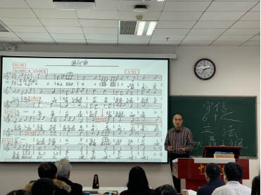 第三位参赛的是艺术教研室胡啸老师,他的授课题目是“从《进行曲》到《中华人民共和国国歌》——谈‘国之歌者’聂耳”。胡啸老师的授课主要围绕三方面展开:(1)展现聂耳的年华与才华,带领学生进一步了解形象丰满的聂耳;(2)分析《进行曲》的音乐本体特征及勾勒其成为《国歌》的演变历程,引导学生进一步体验作品的“经典性”与“权威性”;(3)阐释《国歌法》的现实意义,帮助学生进一步认知这部法律,增强爱国情感。在具体课程授课环节中,胡啸老师利用多媒体教学,PPT、音频结合、演唱和实物演示等手段充分调动学生的积极性。他现场分析、演唱了《义勇军进行曲》乐谱手稿,指出首先Marcia Vivace,为意大利语,乃音乐术语,意为充满活力的进行曲风格。所以,聂耳借此将曲名写为“进行曲”。日后,影片投资人、军人出身的朱庆澜将军在曲名中加入“义勇军”三个字。其次,乐谱用了两种并行的记谱法,即五线谱和简谱。前者主要用于于专业人群,后者主要用于普通百姓。最后,歌词为长短句,音乐是G大调、单声部,全曲共37个小节,旋律建立在G-B-D的基础上。结构上可分为前奏+6个乐句(非方整性数列结构)。此外,特别值得一提的是聂耳在全曲最为重要的“位置”——起来,起来,起来,使用了一个大的箭头,即音乐力度记号,意为渐强。目的与效果不言而喻。最后,胡啸老师现场演唱乐谱,强调了《义勇军》的音乐本体具有“经典性”特质。