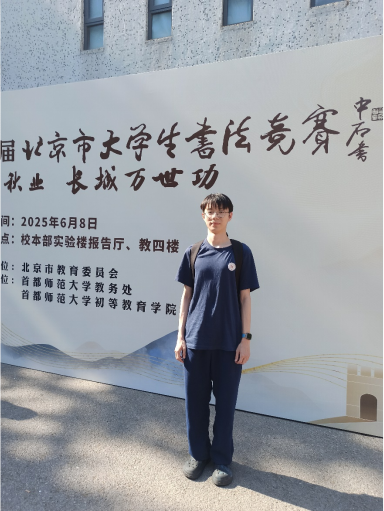 李朗羽同学获奖后表示,“非常荣幸能在第十三届北京市大学生书法竞赛中获奖。这次以‘翰墨千秋业,长城万世功’为主题的比赛,不仅为我提供了一个展示自我、交流技艺的平台,更让我在与诸多书法爱好者的切磋中拓宽了视野、提升了技艺。比赛现场氛围庄重而热烈,每一幅作品都凝聚着作者对传统文化的敬意与热爱。通过这次经历,我更加深刻地体会到书法不仅是笔墨技巧的锤炼,更是心性修养与文化传承的融合。我也想借此机会,邀请更多同学加入到书法的学习与研究中来,共同感受中华文化的深厚底蕴与艺术魅力!”