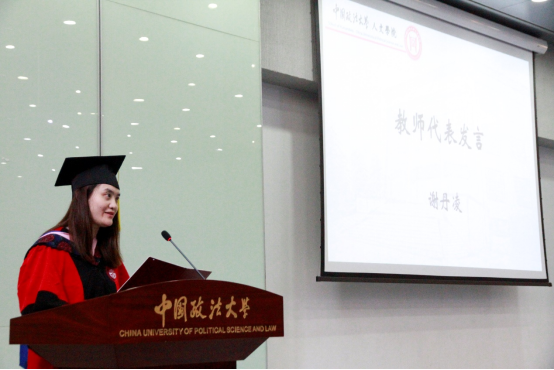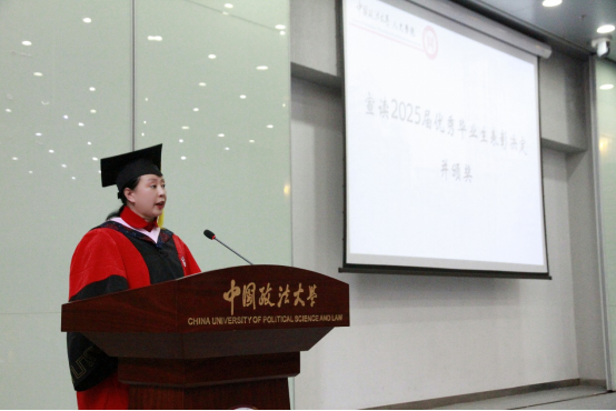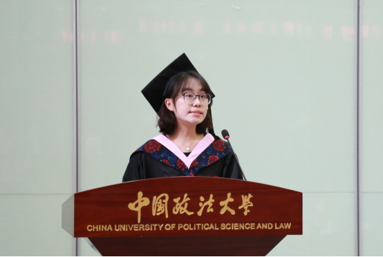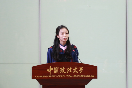 本科毕业生代表、2021级哲学专业虞惠任同学从“为什么学文科、学哲学有什么意义”两个常被问到的问题出发,向我们讲述了她在不同专业课程的感悟收获以及求学间对专业学习的理解。每一次思维上的尝试,都拉近求学者和这个世界,以及和真正的自己之间的距离。她希望能与毕业生们一起,带着“法大人文、人文法大”赋予的勇气和底气,在“爱智之路”上行稳致远,不断追求正义和智慧。最后,作为端升书院第一期毕业生,虞惠任用“端行精进、如日之升”祝福在场各位,愿大家在真理沐浴下的生命之树越发繁茂。