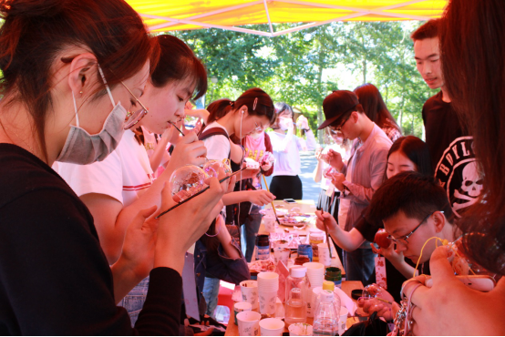 5月12日下午,制作风铃和许愿牌的展台前,人群早早聚集起来。满怀期待与喜悦,同学们在展台前专心致志地创作,属于自己的独一无二的风铃。最后满怀真挚地在风铃下的纸条上,写下自己想说的话。展台前总是会有几个好朋友或者一对情侣团坐,或甜蜜或雀跃地商量着笔下的内容,不时互相评价一番,欢声笑语从不间断。骄阳也击不退大家的热情,展台边熙熙攘攘的人群和青春活泼的气息,彰显出活动的盛况。