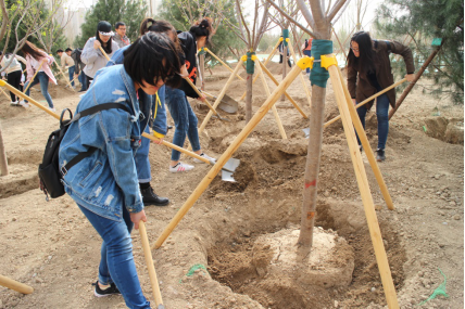 下午一点二十分,同学们于学院路校区正门集合,乘车前往清河。一路上同学们怀揣着兴奋期待的心情讨论着即将进行的植树活动,商讨着如何组队完成植树任务。到达目的地后,映入眼帘的是一片略显焦枯的土地,工作人员热心地向同学们介绍这项富有意义的义务绿化活动。在简单交代了注意事项后,大家纷纷拿起铁锹,干劲十足冲上土坡为树苗培土浇水,男生女生们通力协作。在大家的共同努力之下,荒地上渐渐呈现出一片喜人的绿意。