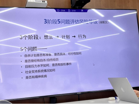 在共性与个别环节,余老师首先从当前心理育人的宏观角度切入,介绍了学校、学院、班级、宿舍四层级心理育人框架结构。之后又切换到个体的角度,她指出心理困扰是人的一生无法回避的难题,也是高校心理健康建设不可忽视的问题。在层层群体划分中,彼此的联系越来越紧密,而宿舍是最小的单元,同学们一句微不足道的关心话语,往往最能温暖人心。在危机与干预环节,余老师通过解读心理健康的定义、心理状态的判断标准为同学们解释如何识别心理危机。主要内容包括“十个问题,快问快答”“心理健康的三条通俗易懂的标准”“心理健康的专业评判标准”“危机的定义、特点、分类”“危机的八种表现”“评估风险的三阶段五原则”“干预六步法”等等,为同学们建立了“心理危机识别与干预”的知识概观。