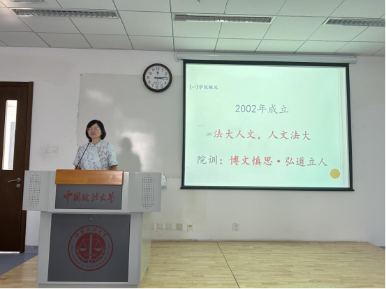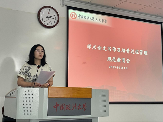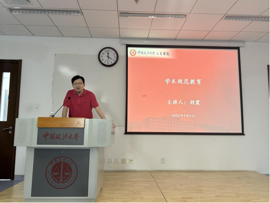 刘震教授则聚焦 “学术规范与论文写作” 主题展开深度分享。他结合近年来多起真实案例,明确指出伪造发表记录、抄袭他人成果、盗用研究数据等学术不端行为,不仅将受到学校严肃处理,还会纳入个人学术信用档案。“学术诚信是研究生学术生命的根本基石,一旦受损,不仅影响学位获取,更会对未来学术发展与就业前景造成不可挽回的影响。” 刘震教授强调。他鼓励新生尽早明确研究方向,积极申报校、院两级科研项目,并将科研项目申报书形象地喻为 “前期开题报告”,认为撰写申报书能系统提升选题设计、文献梳理与学术论证能力。针对学术成果保护,刘教授特别提醒新生谨慎在公共网络平台上传论文稿件,避免成果被篡改或不当使用;在人工智能技术普及的背景下,更需强化原创意识与自我保护意识。最后,他叮嘱新生要自觉遵守法律法规与校纪校规,以理性平和方式处理矛盾,为自己留下充实美好的法大记忆。