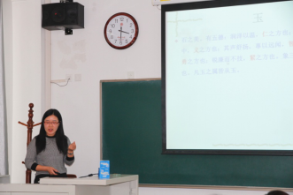 中文教研室的张文老师从《说文解字》中的玉部字出发,讲解了玉部字所具有的丰富传统文化内涵,短短二十分钟课程下来,原来小小的玉石竟然成为表达中国传统社会等级观念的载体,涉及了政治,军事甚至丧葬等诸多领域。在讲解过程中,张文老师还带来了玉石实物,使得大家更加直观地感受到玉石在我们生活中的广泛作用。