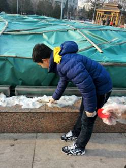 尽管天气寒冷,但是大家都兴致勃勃,充满热情,希望可以通过自己小小的行动来服务社会。班委成员在之前做好了策划和充分准备,同学不顾天气的寒冷,认真清理广场的每一个角落,不怕辛苦,弯着腰捡垃圾。