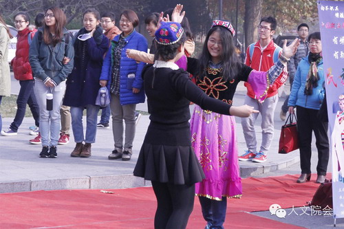 紧接着上场展示的是来自雪莲花协会的同学们,他们身穿新疆服饰,在一段充满西域风情的音乐中开始与现场观众互动,他们礼貌地邀请在场的观众加入他们的舞蹈中,与现场观众友好互动,展示着自己的民族风情,热情的舞蹈引来现场一阵阵掌声。