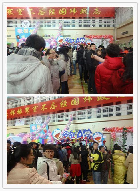 被体育馆通透精亮的灯光感染,一走进去火红而又不失气派的晚会舞台矗立在体育馆中央,舞台两侧则是四块闪光屏,上面布满了闪动的“星星”,充满了希望和灵动之感。最为热闹的恐怕要数体育馆两侧各学院的游戏场地了,一串串的长龙排在了各学院的展台前,大家都按耐不住喜悦的心想要“大试身手”,获得奖券。