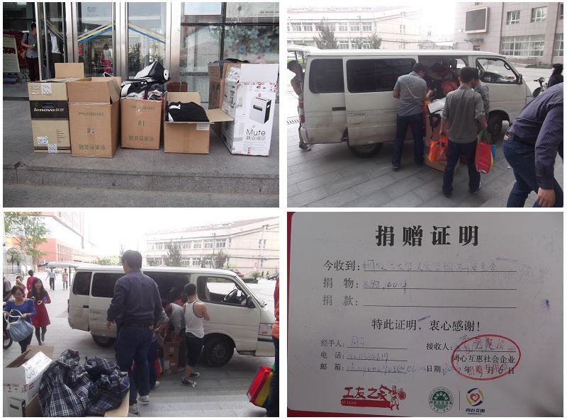 “同心互惠”是NGO组织通过经营的渠道为公益事业筹集资金的新型模式。是通过面向社会公益募捐及回收筹集闲置富余物资、在打工者社区开办“同心互惠公益店”进行义卖,以降低打工者的生活开支、发展移民社区的合作消费,从而改善打工者群体的生存状况。经联系,5月6日下午,“同心互惠”两名工作人员来到学校接收衣物,和同学们一起将所有衣物搬放至车内。最后,“同心互惠”的工作人员还给予了捐赠证明。