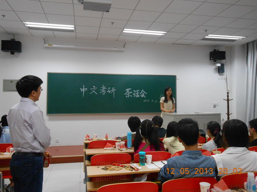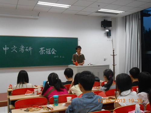 2013年5月12日晚七点至九点,中文考研茶话会在逸1033举行。活动邀请到徐文贵老师做主持嘉宾,杨望龙(浙江大学文字学)、余书涵(中国传媒大学艺术美学)、高薇(保研北大中文系)做主讲嘉宾。共有二十余名同学参与,涵盖大一至大三各年级。