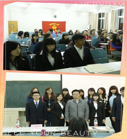 接着是颁发聘书环节。主席王帅及副主席郑成琼分别为各部部长和干事颁发聘书并合影定格这光荣的瞬间。紧接着颁奖环节的是学生会主席的致辞。王帅主席语重心长的嘱咐所谓“干事”,不仅是做事的意思,更是想事情的意思。将多动脑子、多思考问题、更好地建设人文学生会的希冀寄予学生会全体成员。“现在一起努力,将来一起给力”,“院会怎么样,取决于我们自己怎么样”,主席的讲话让我们心情激荡。