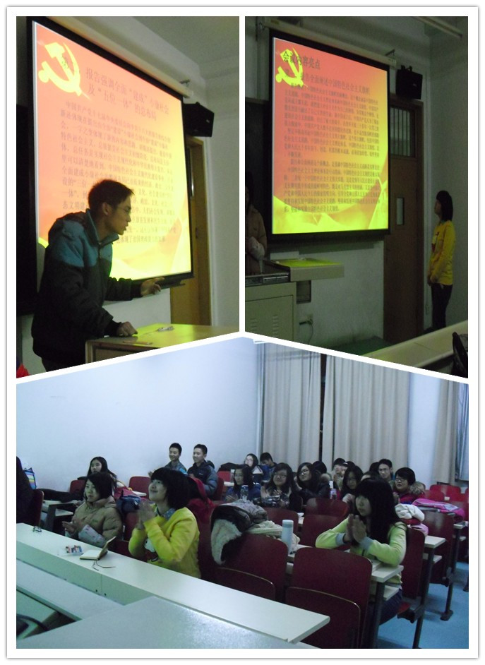 随后,吴志刚、邹坤两位同学作了重点发言,分别表达自己对于党的十八大的看法。吴志刚同学认为我们不能形成精神懈怠,要用理想带领自己坚持下去。他为我们分析历届领导人的履历,由履历的提高带领我们思考领导人的知识水平将对党的发展方向起着重要作用,最后他用习近平总书记的一句话作为结语并表示了自己的希望:反腐不是一个活动,而是一个长期的政策。邹坤同学由文化和生态方面入手,他强调了生态环境保护的重要性、文化建设的必要性及国防安全的问题。他和同学们分享了自己的想法:我们党才建立90多年,我们应该用一种更为宽容的态度来面对它,而不是用严苛的态度要要求它。作为局外人,我们不应当说不理智的话,换位思考来理解领导人的想法与难处。两位男生的发言让我们陷入思考,同学们说出自己的不同看法,在思想的碰撞与摩擦中,同学们不仅收获了快乐、深刻地了解党的十八大的内容与精神,更多的是告诉自己要有一颗关心国家的心,心系祖国,学会反思。