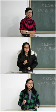 接下来,15中文班的李衍泽、施语进行了中文学习经验的分享。两位同学将中文班的课程分类讲述,具体介绍了中文课的平时学习方法和考试复习经验,施语强调了大学中学习英语的重要性,还分享了平时生活中学习英语的方法。
