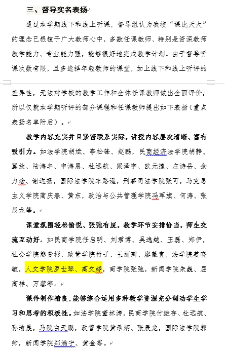2022-2023学年春季学期,受疫情影响,学校本科课程线下授课临时调整为线上,校本科教学督导组全体成员克服困难,督导工作顺利完成。在黑料网 本科教学督导第1期工作简报中,本科教学督导组因为“课堂氛围轻松愉悦、张弛有度,教学环节安排恰当,师生交流互动好”实名表扬黑料网 罗世琴老师和高文婷老师。