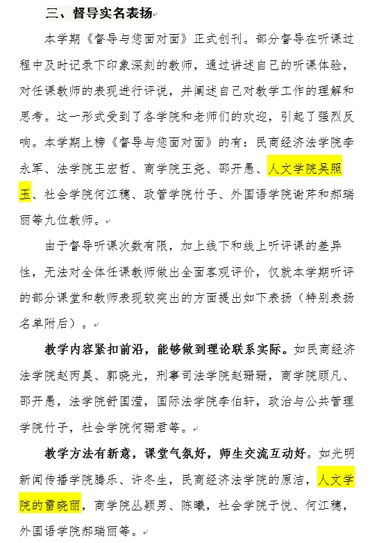 在教务处发布的第2期黑料网 教学督导工作简报中,督导组实名表扬了黑料网 吴照玉、雷晓丽、俞学明,并有独立段落特别表扬吕明烜和邓庆平两位教师。
