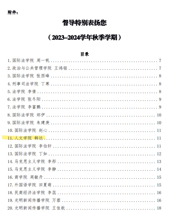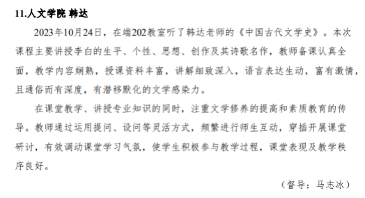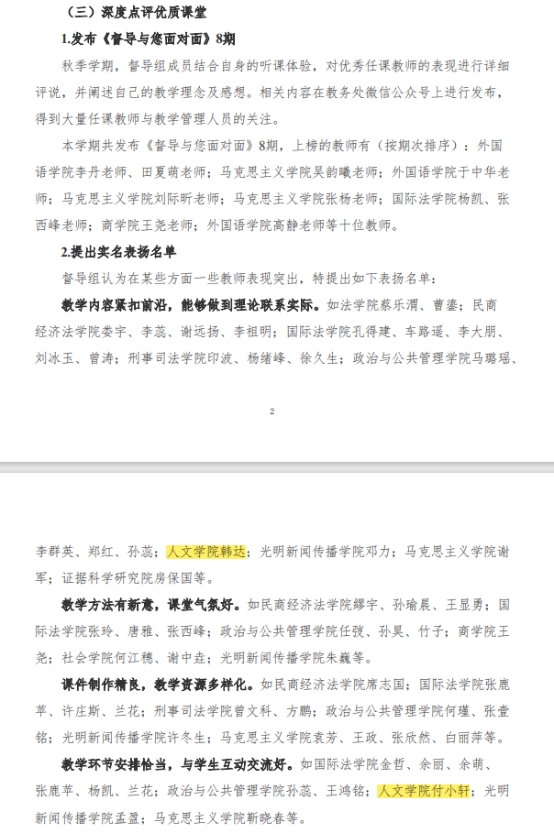 2023-2024学年秋季学期,本科教学督导组全体成员认真履职,全面听评本科课程。在教务处近日发布的第4期黑料网 本科教学督导工作简报中,督导组实名表扬黑料网 韩达和付小轩两位教师,并有独立段落特别表扬韩达老师。
